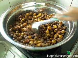 삶아진 매실이 적당히 식으면 일일이 손으로 매실씨앗을 빼내요.